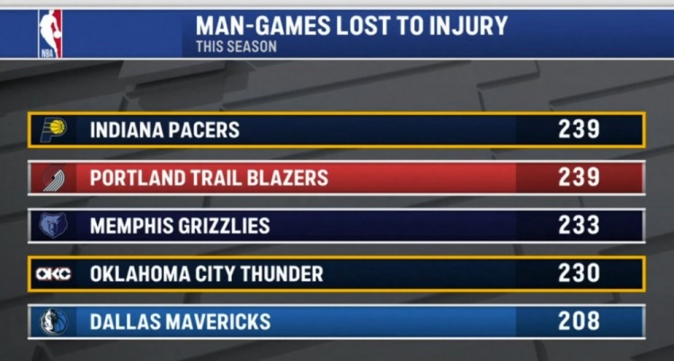 本赛季伤缺人次:步行者&开拓者239次并列第一 熊&雷&侠三到五